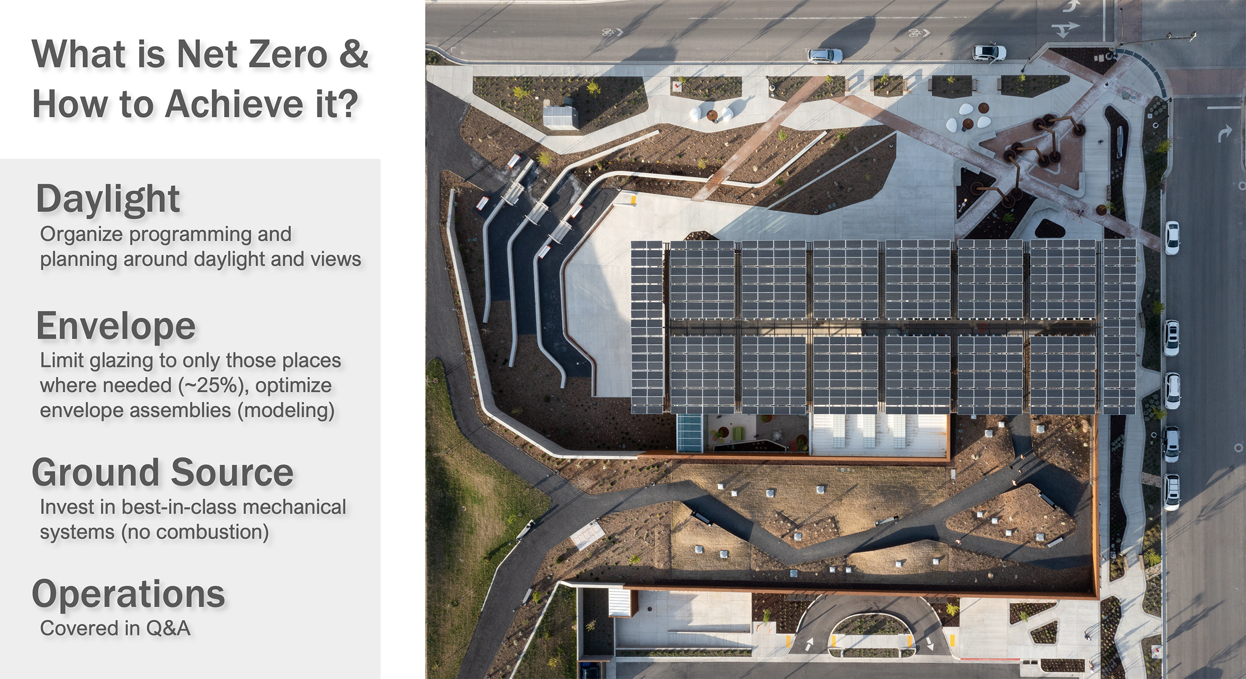 The presentation demonstrated the path that the Daybreak Library employed to become International Living Future Institute (ILFI) Zero Energy Certified, which required world class efficiency with 100% of the annual building energy load offset with on-site renewables without the use of combustion-based systems.